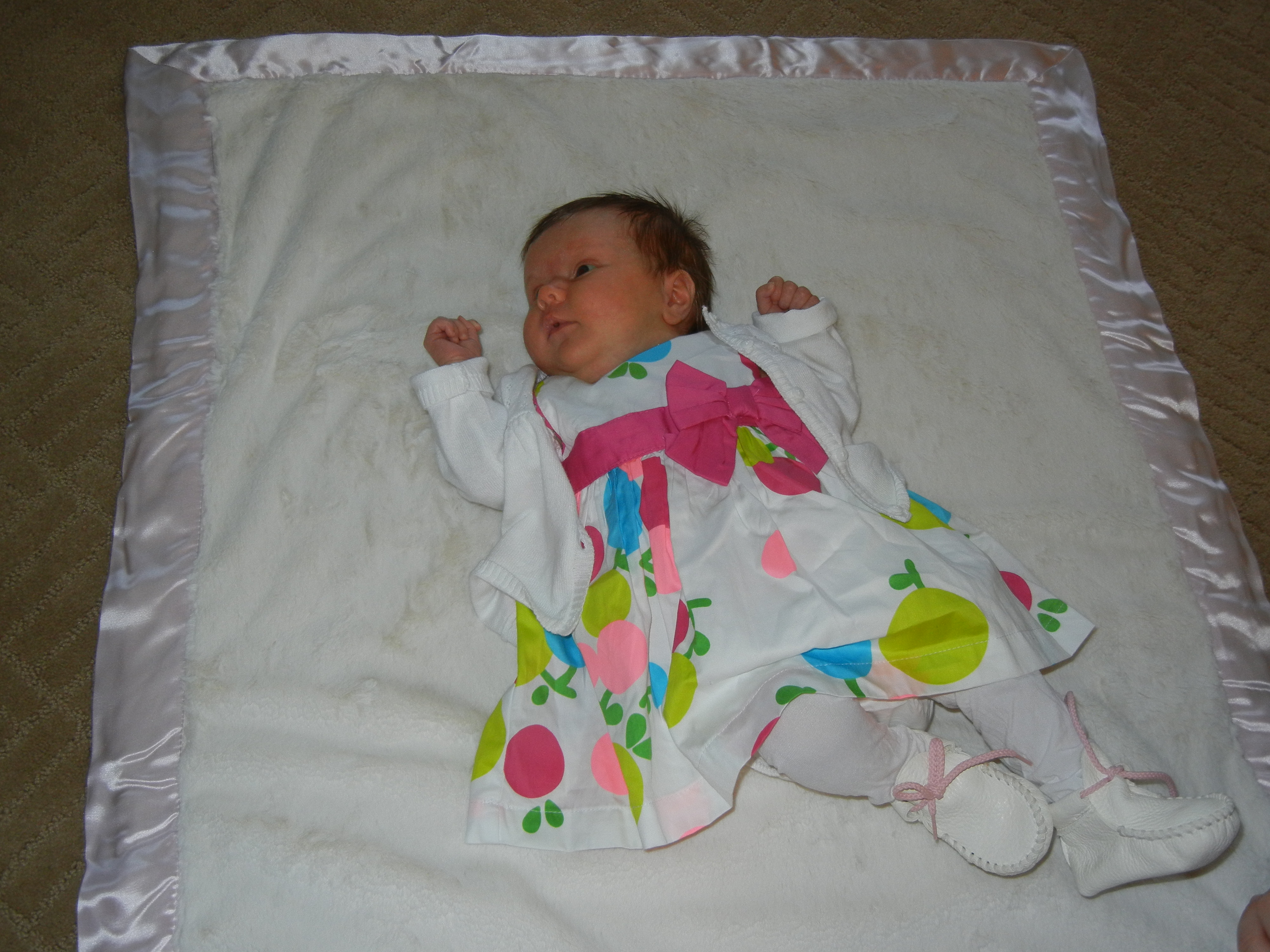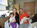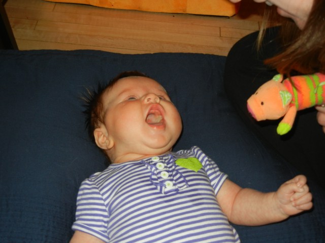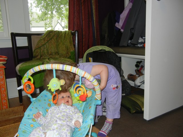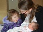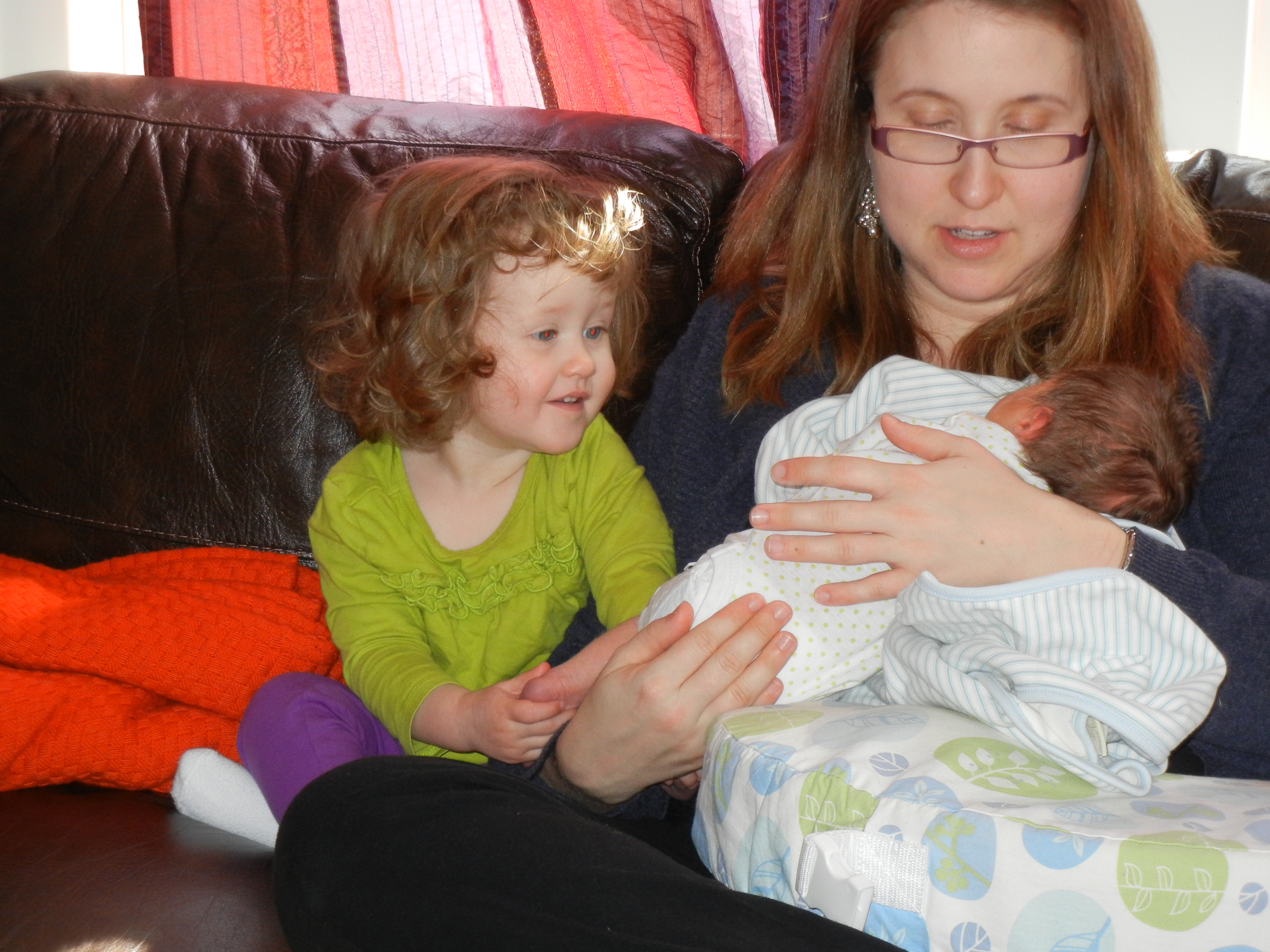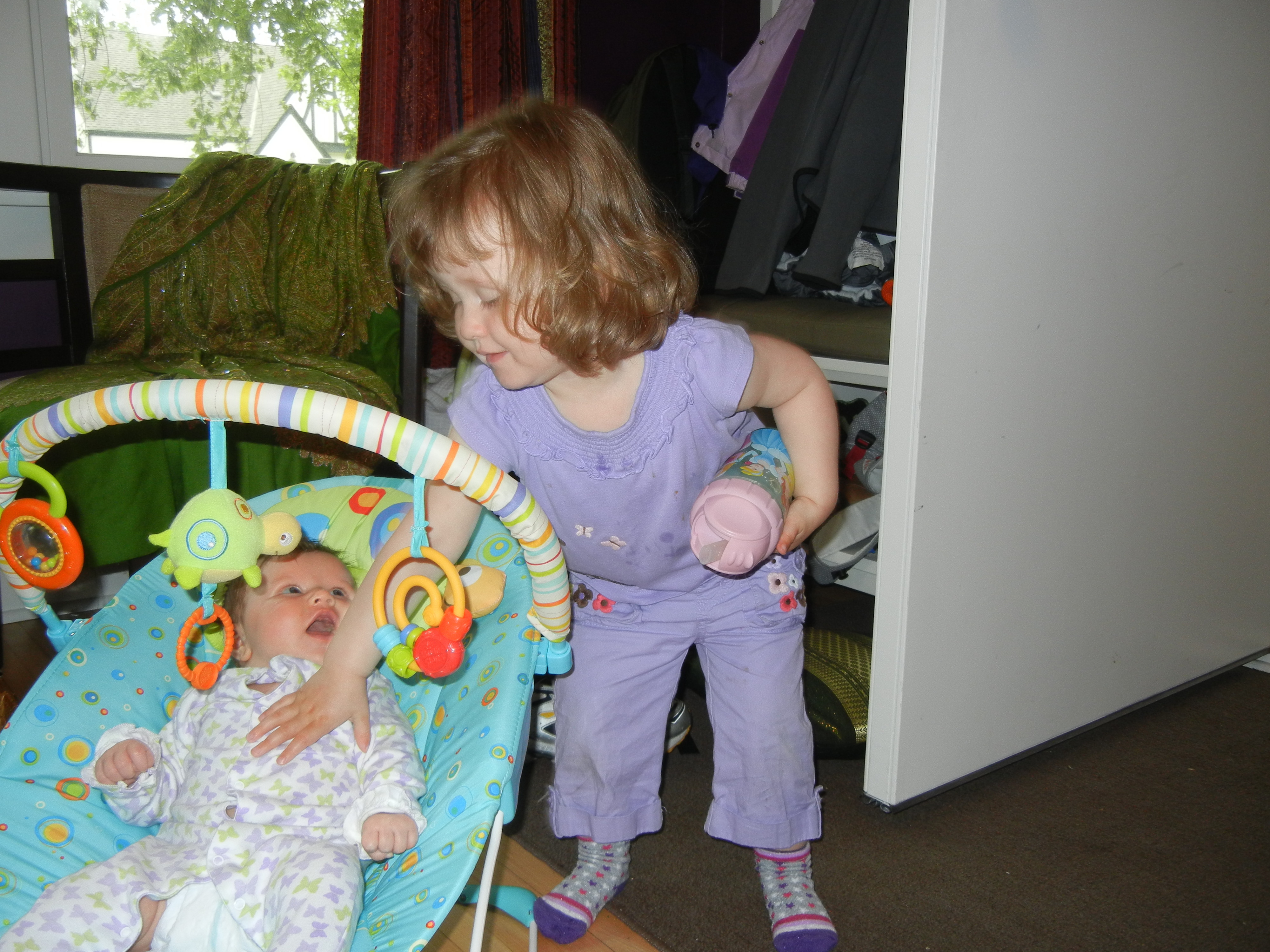 Elizabeth arrived home without a whole lot of fanfare, as her big sister was in the middle of a nap. But Evelyn was very excited when she woke up, and was eager to play with her baby sister. Here she is tickling Elizabeth’s feet.