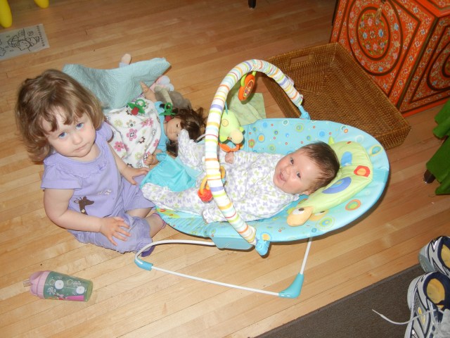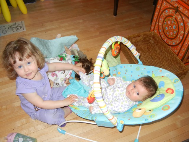 Evelyn is a great big sister, and helps with diapers and burping. She also makes sure Elizabeth keeps her socks on; this is a very important point for Evelyn.
